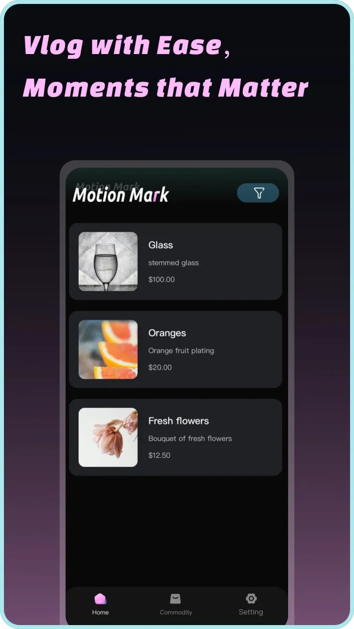 Motion Mark is your shopping companion, allowing you to effortlessly collect and organize your favorite items across various categories. With detailed item displays and customizable shelves, it keeps all your shopping inspirations in one place for easy access and enjoyment.